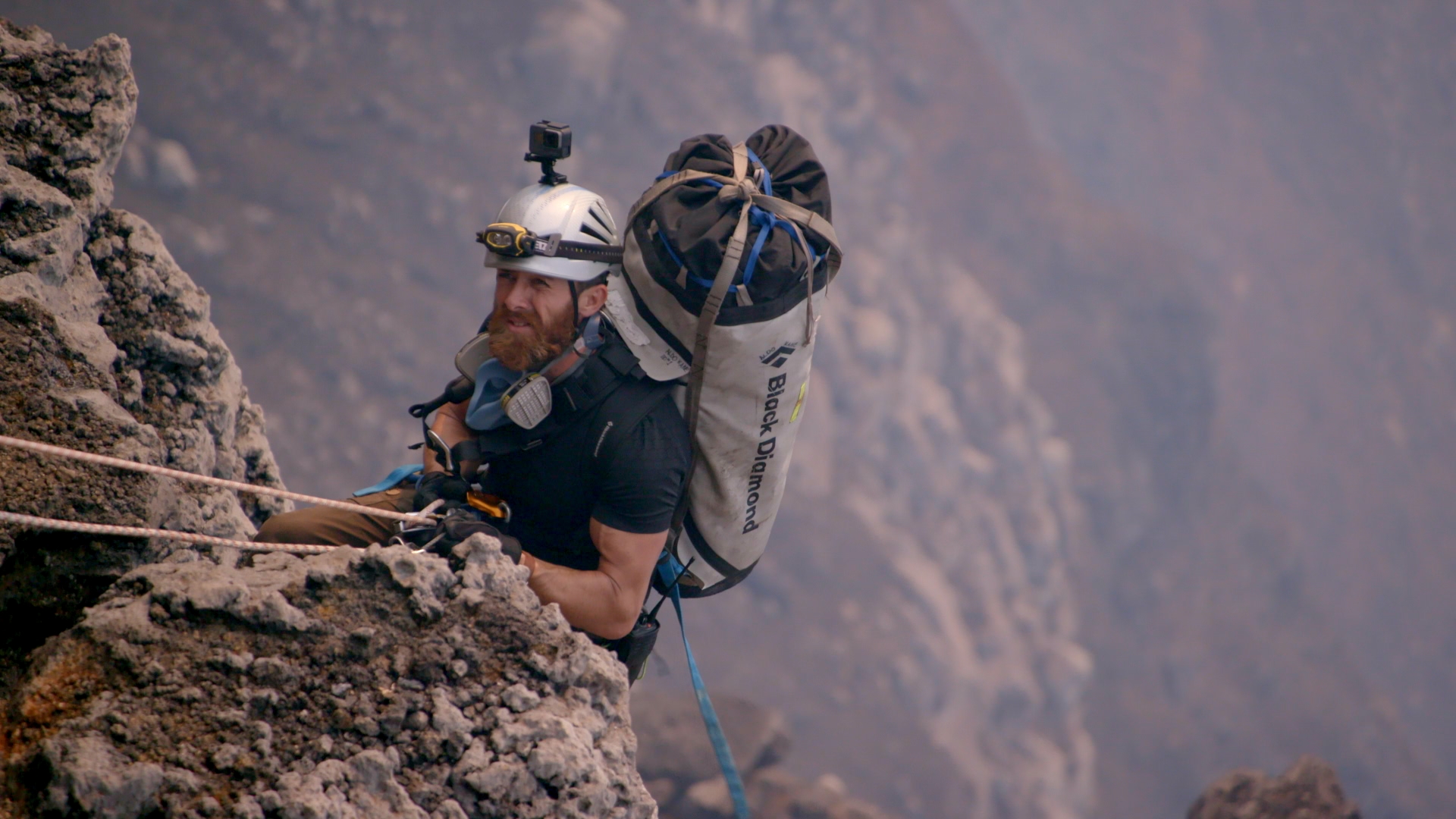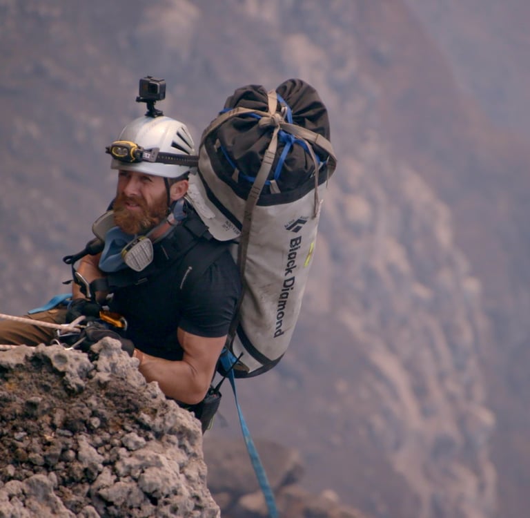 The volcano at the centre of Aldo’s story is Mount Nyiragongo, home to the largest lava lake on the planet. Access requires kilometres of rope rigging down crumbling ash, constant exposure to toxic gases, and working inside a caldera that is slowly collapsing in on itself.