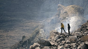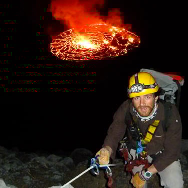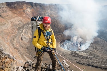 The volcano at the centre of Aldo’s story is Mount Nyiragongo, home to the largest lava lake on the planet. Access requires kilometres of rope rigging down crumbling ash, constant exposure to toxic gases, and working inside a caldera that is slowly collapsing in on itself.